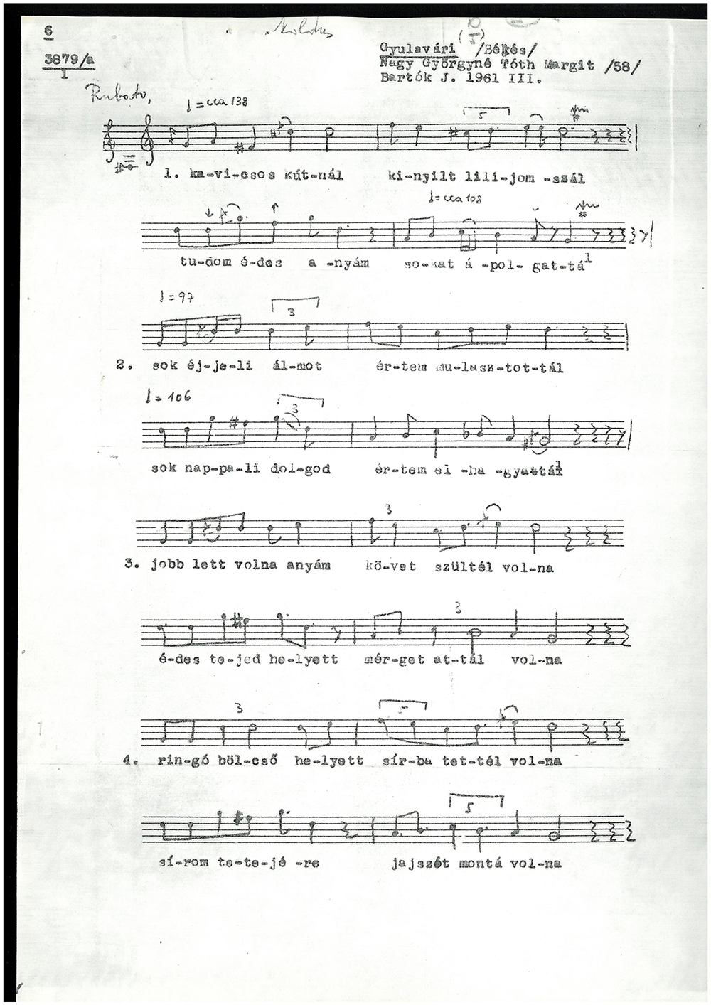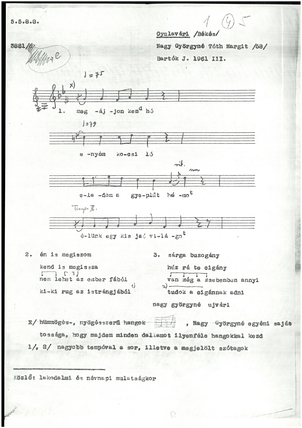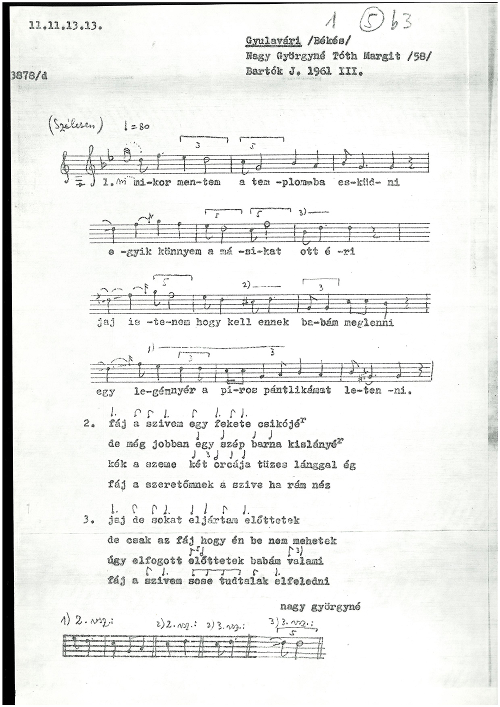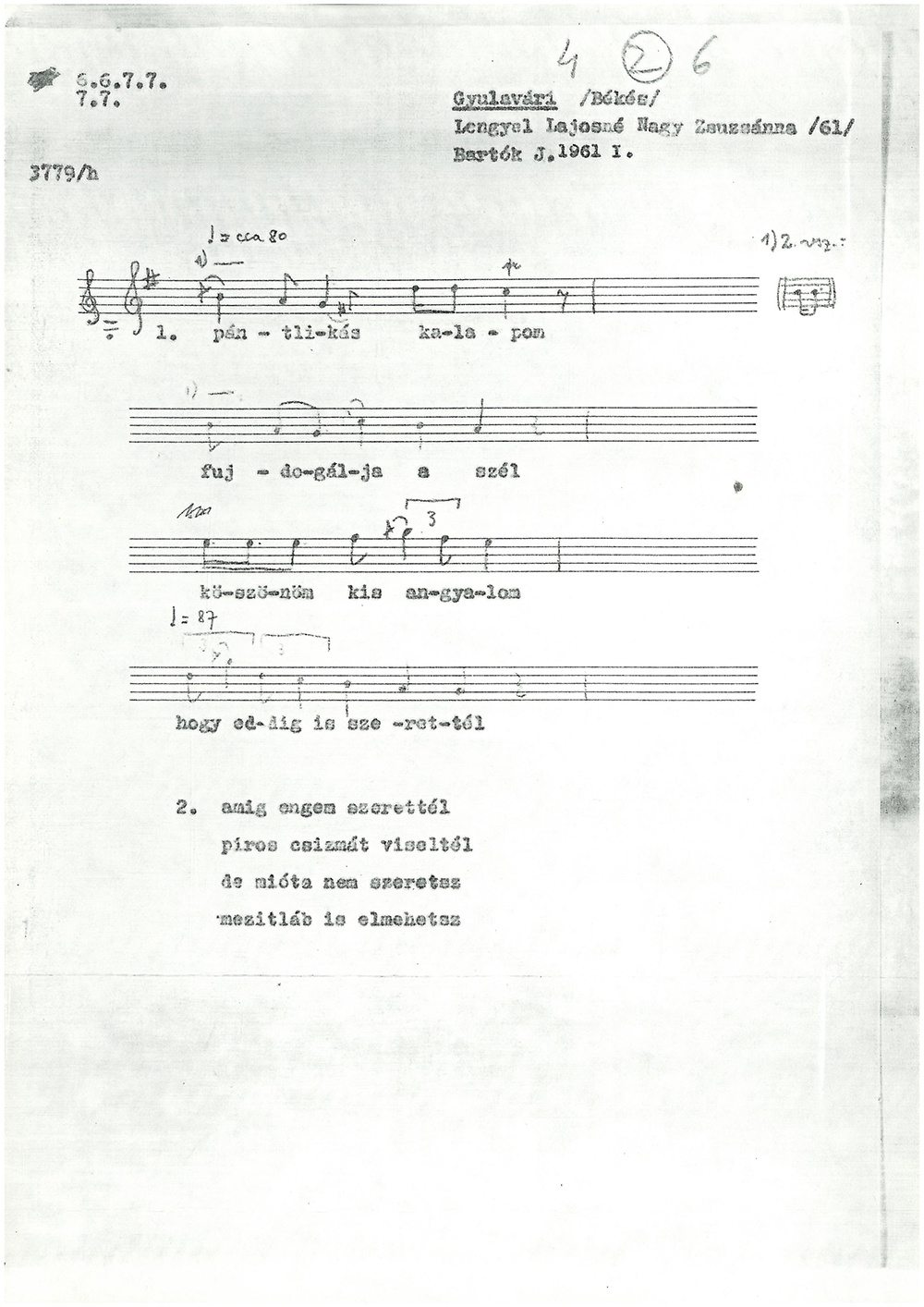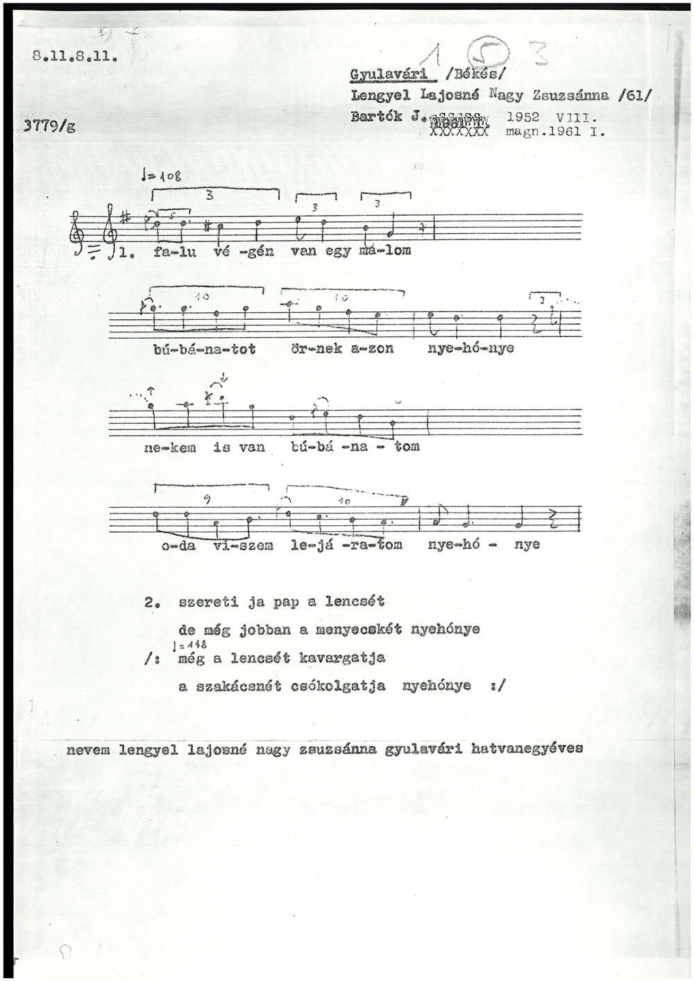 Kavicsos kútnál kinyílt liliomszál MTA BTK Zenetudományi Intézet 1961.03.19 Bartók János Gyulavári Békés Nagy Györgyné Tóth Margit   58 magyar