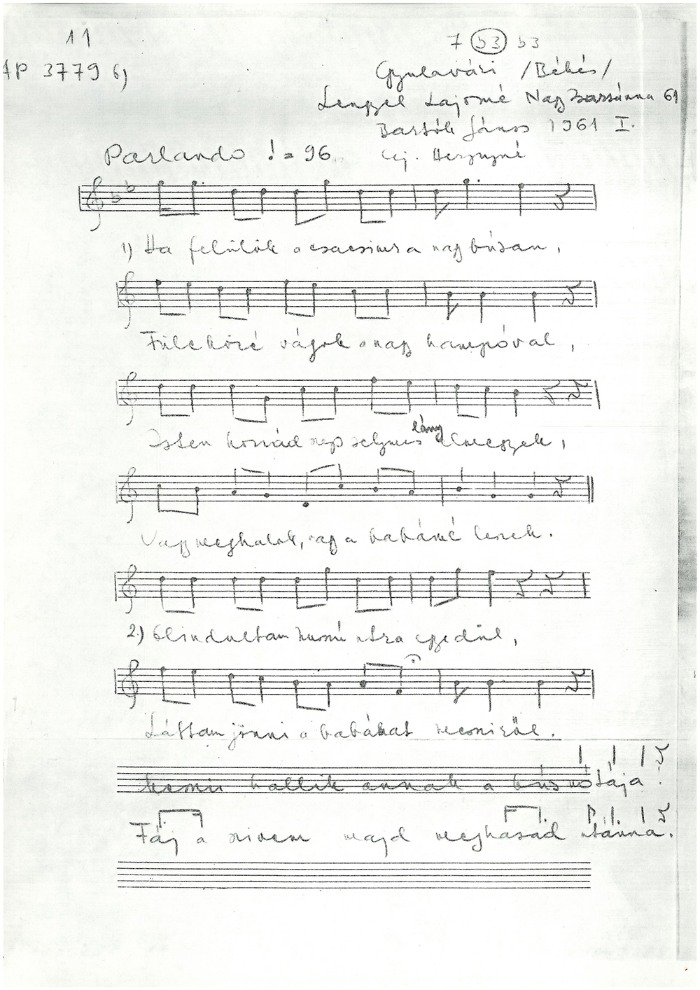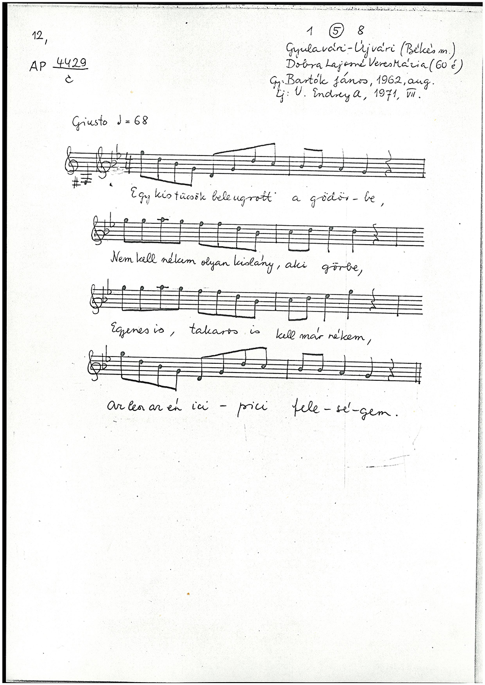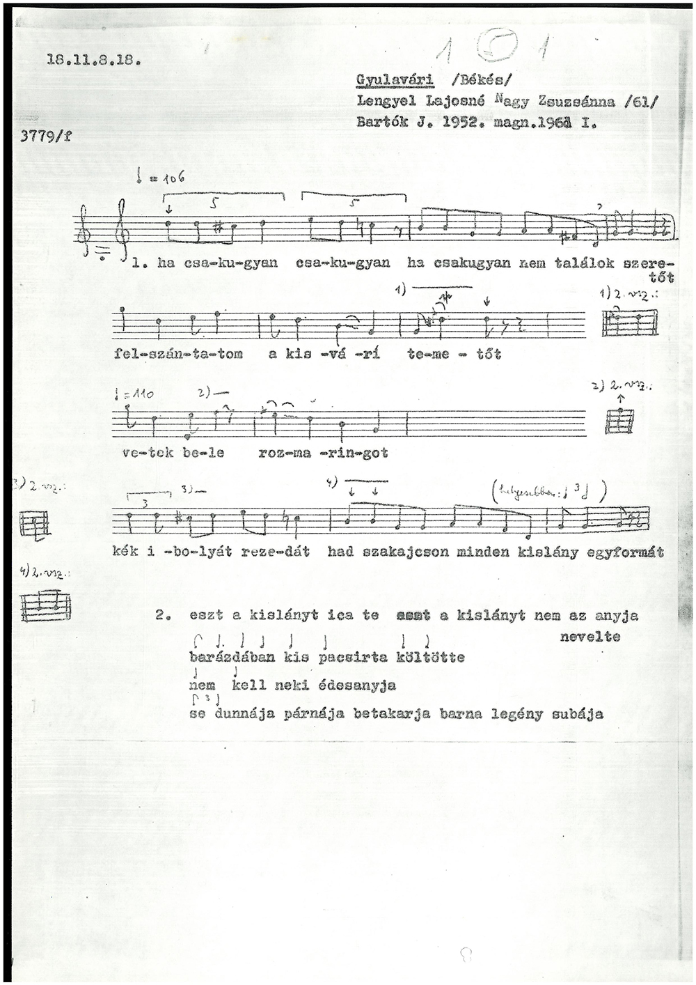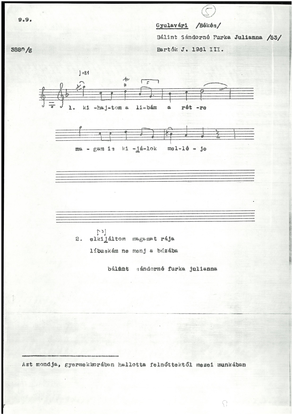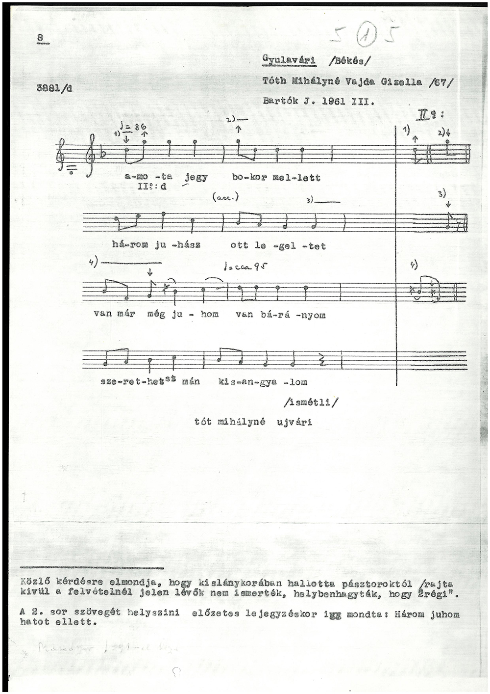 Kavicsos kútnál kinyílt liliomszál MTA BTK Zenetudományi Intézet 1961.03.19 Bartók János Gyulavári Békés Nagy Györgyné Tóth Margit   58 magyar