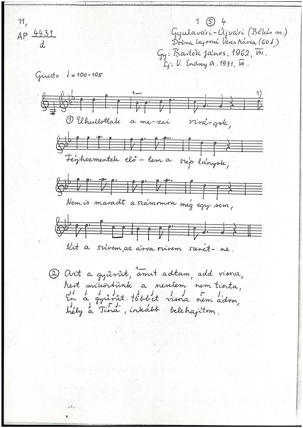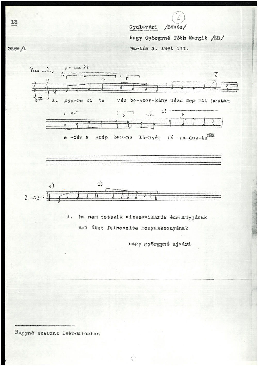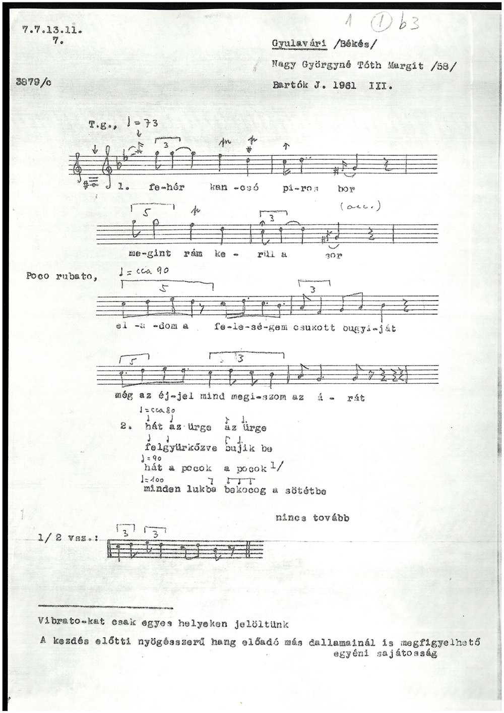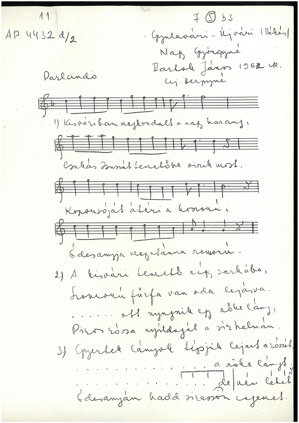 Kavicsos kútnál kinyílt liliomszál MTA BTK Zenetudományi Intézet 1961.03.19 Bartók János Gyulavári Békés Nagy Györgyné Tóth Margit   58 magyar