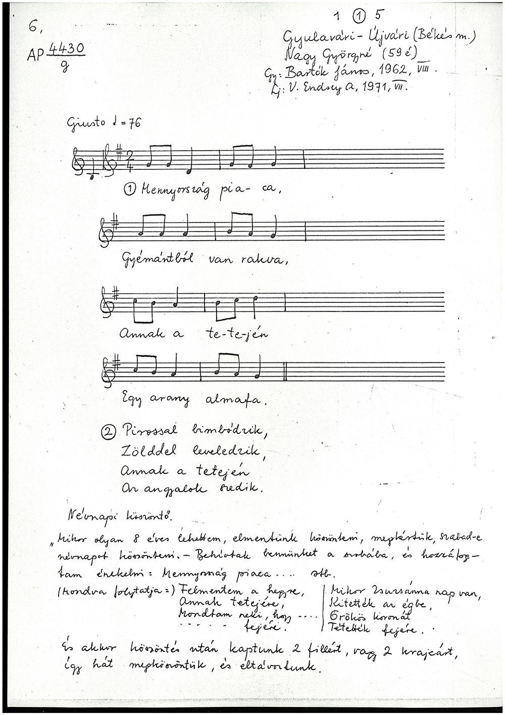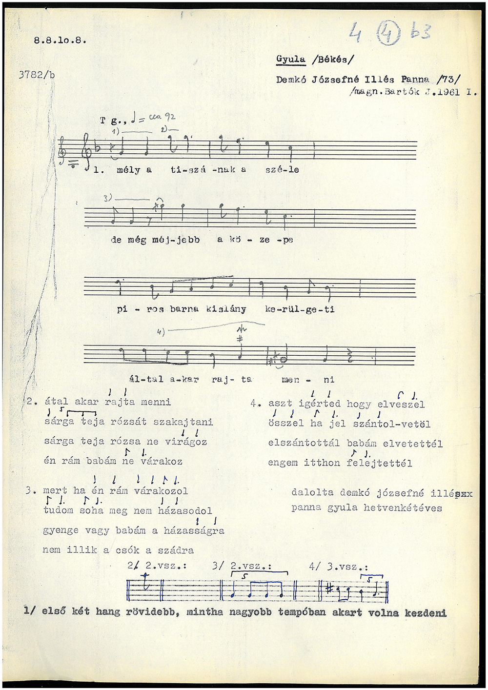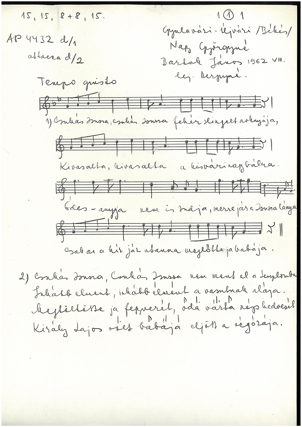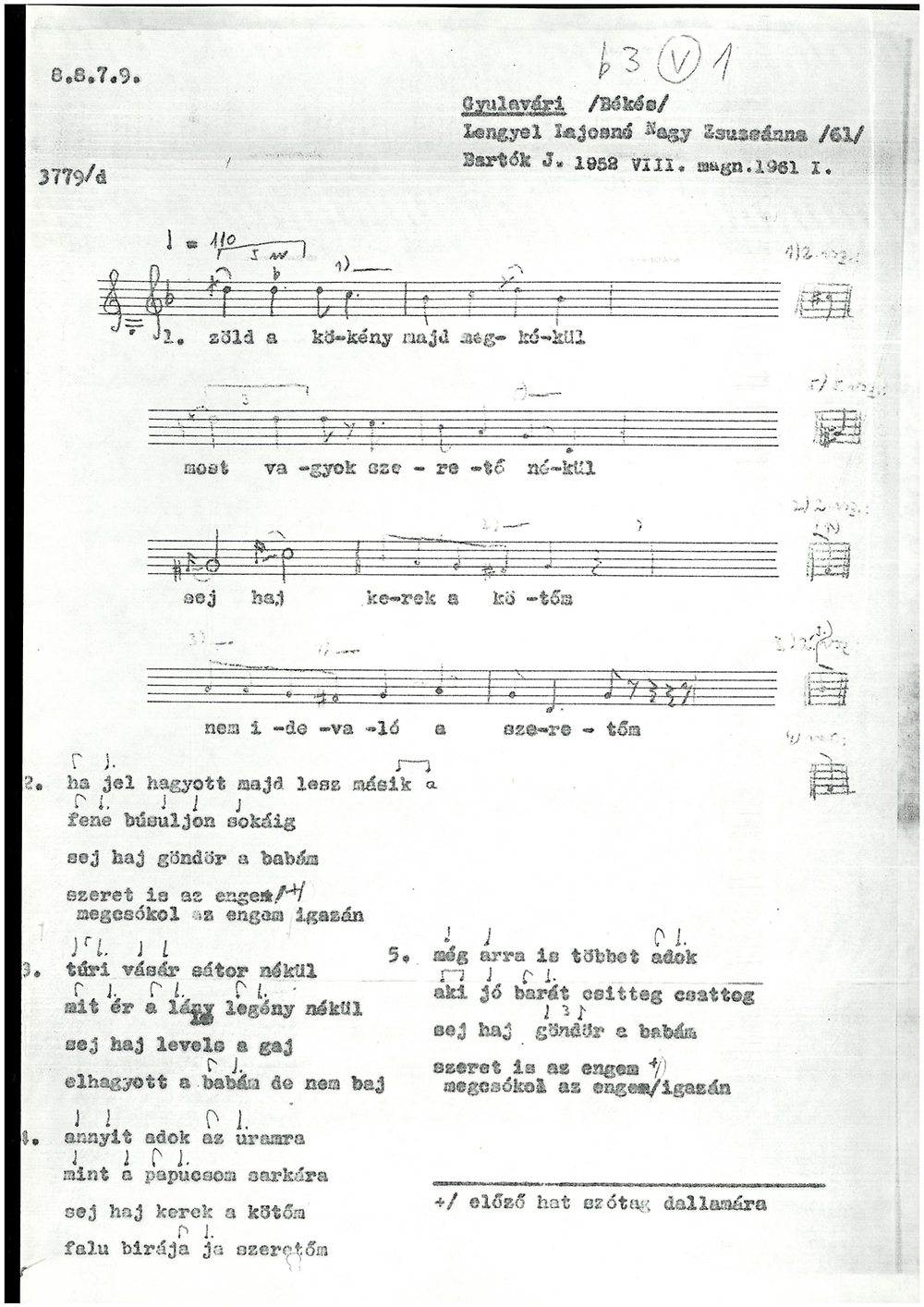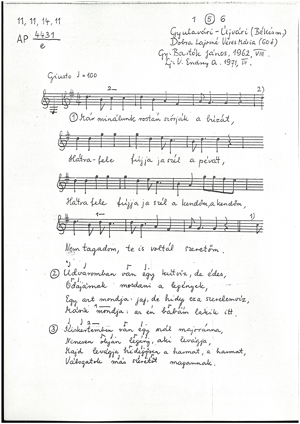 Kavicsos kútnál kinyílt liliomszál MTA BTK Zenetudományi Intézet 1961.03.19 Bartók János Gyulavári Békés Nagy Györgyné Tóth Margit   58 magyar