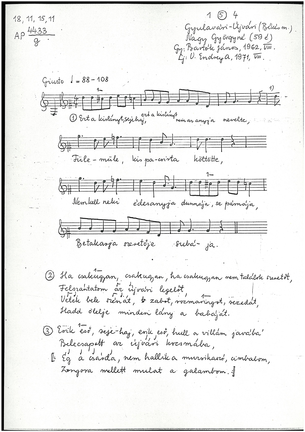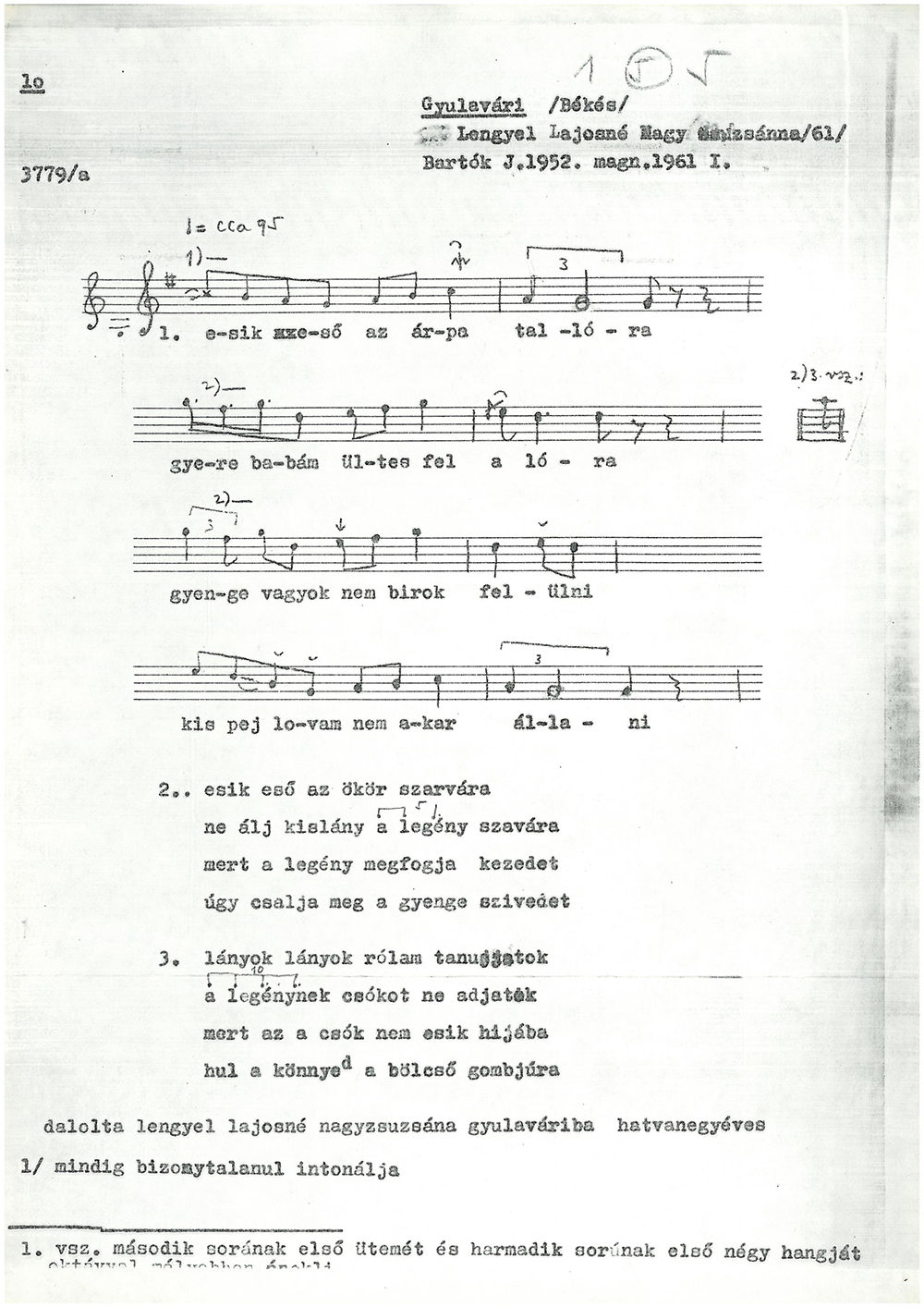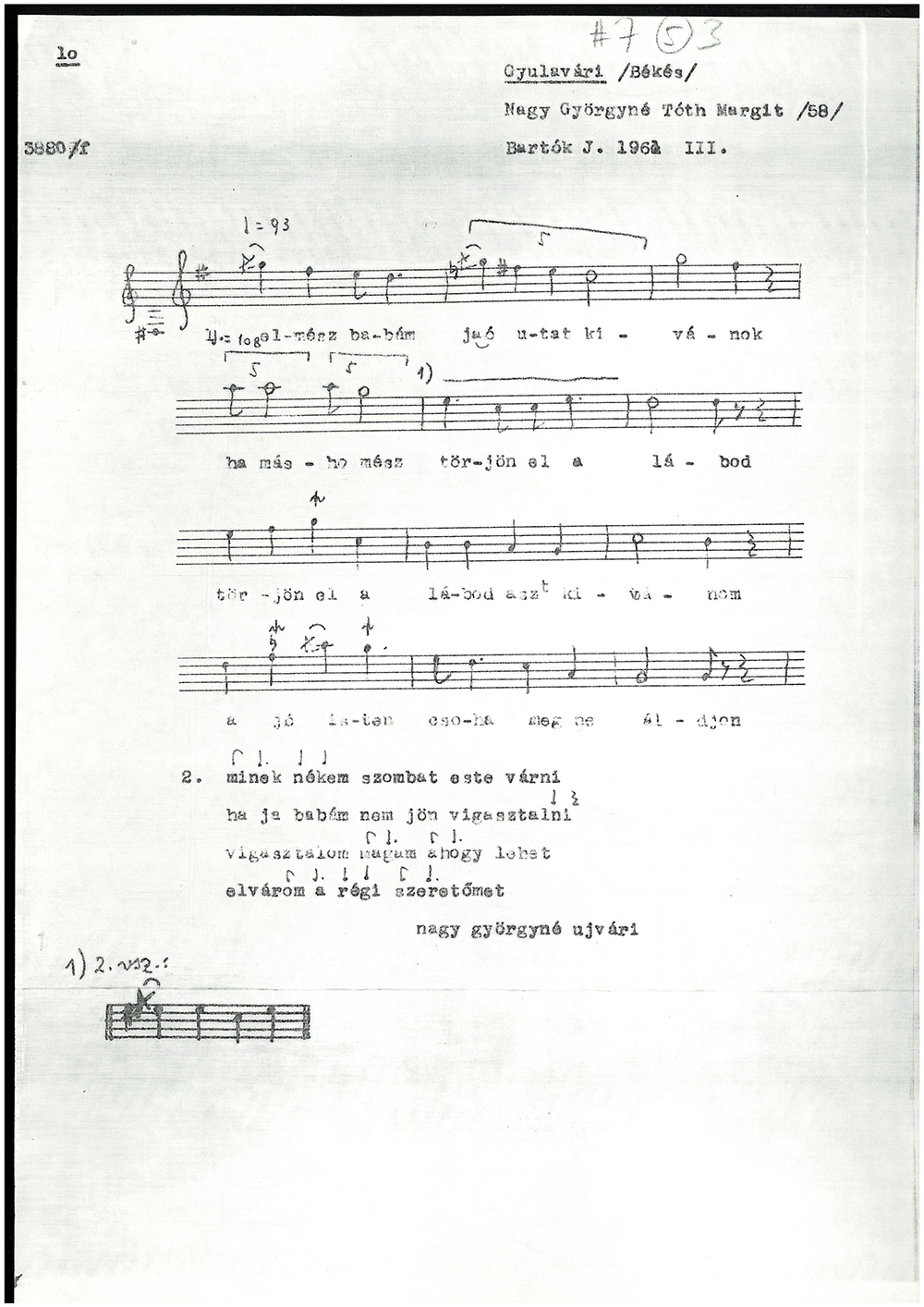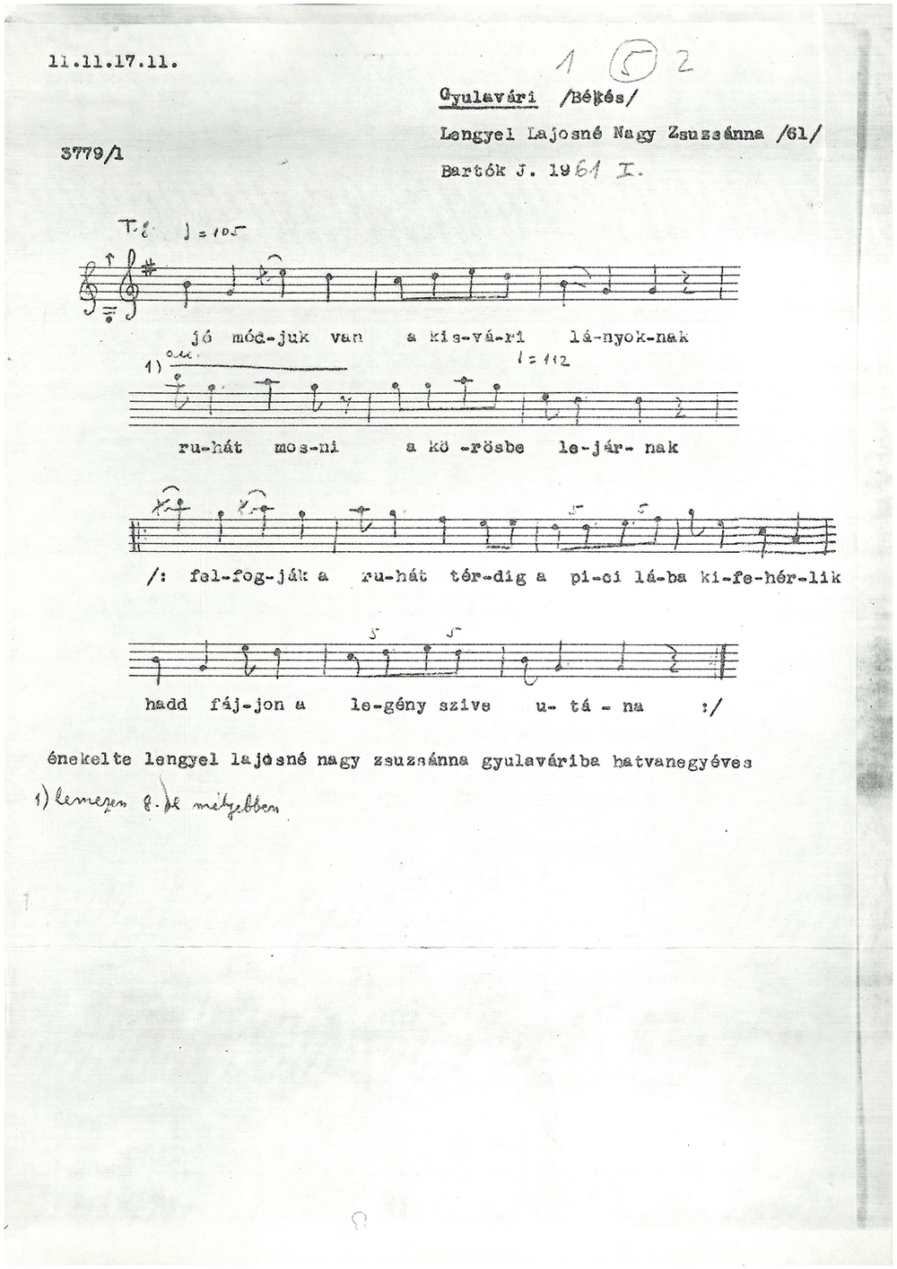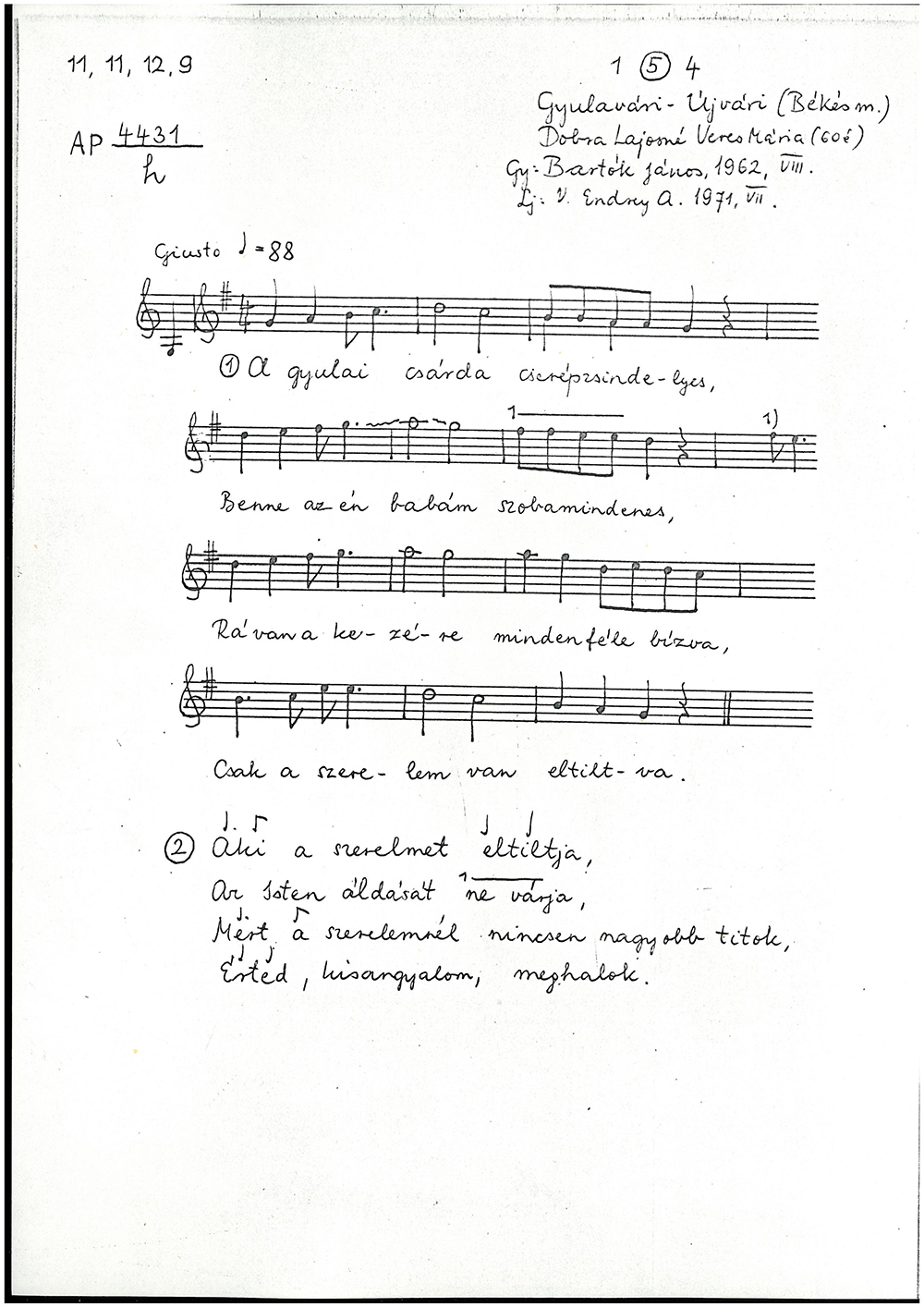 Kavicsos kútnál kinyílt liliomszál MTA BTK Zenetudományi Intézet 1961.03.19 Bartók János Gyulavári Békés Nagy Györgyné Tóth Margit   58 magyar