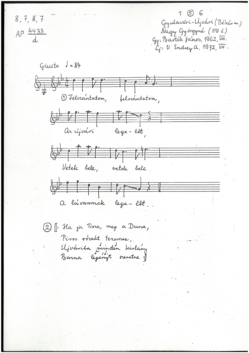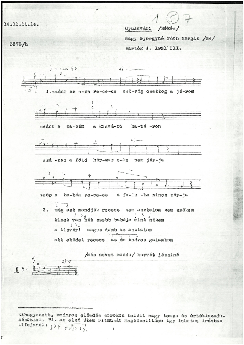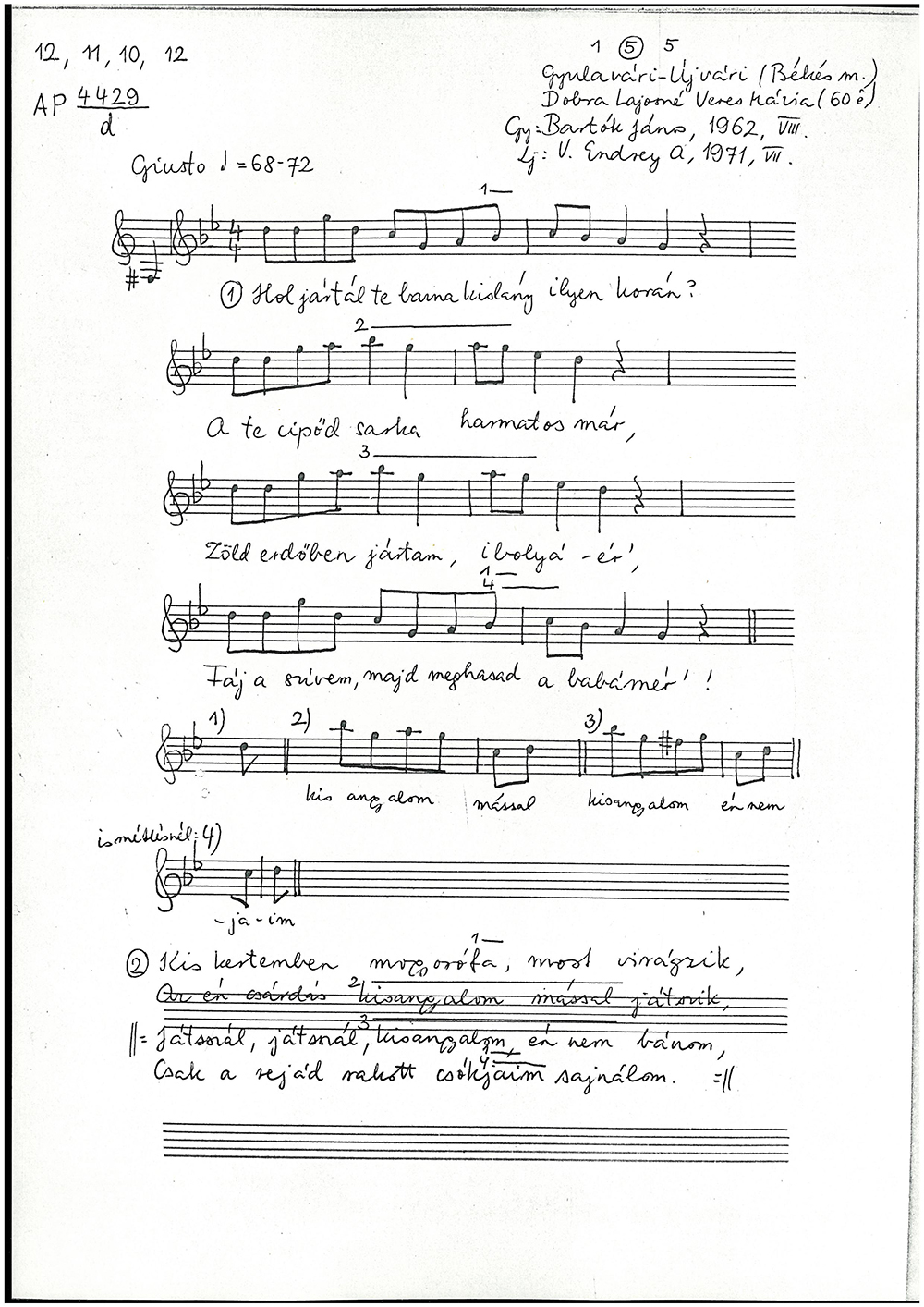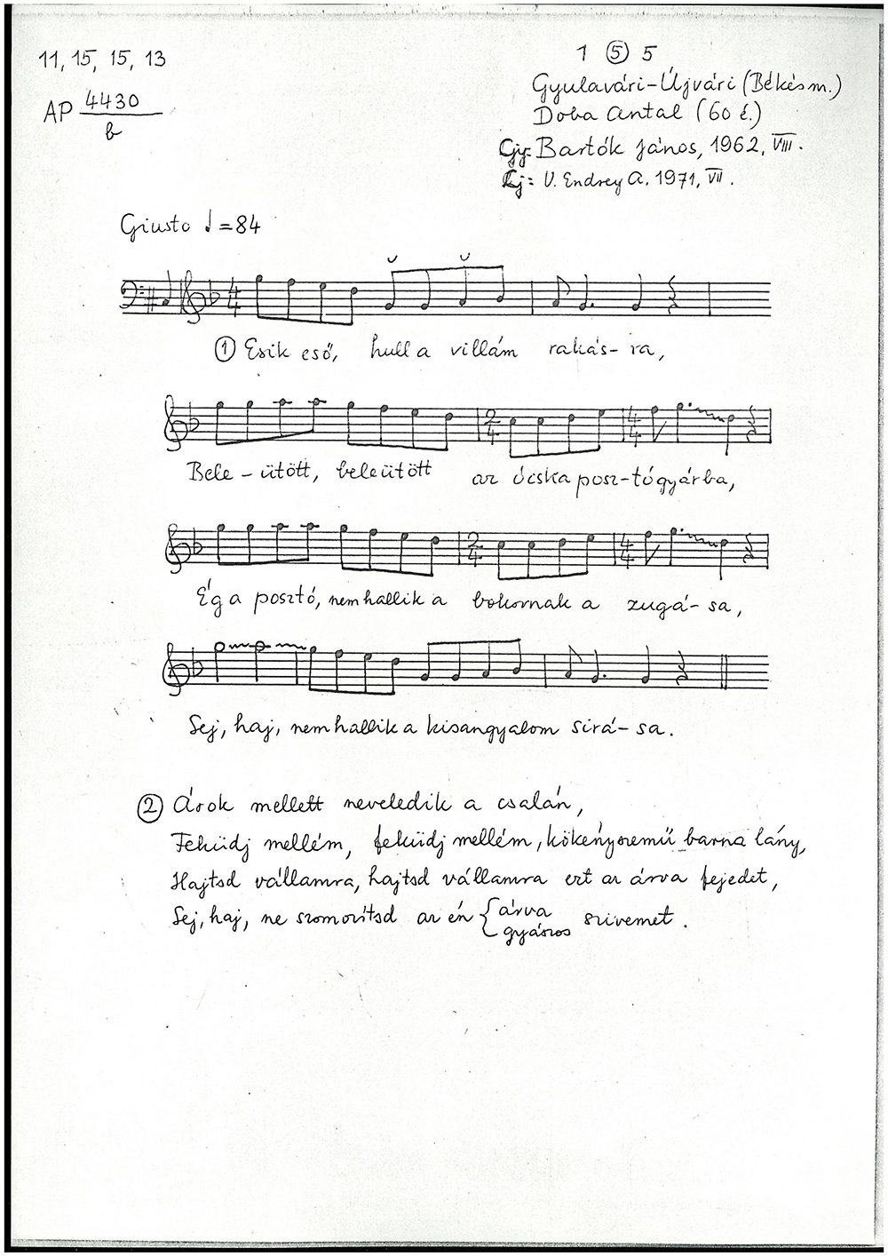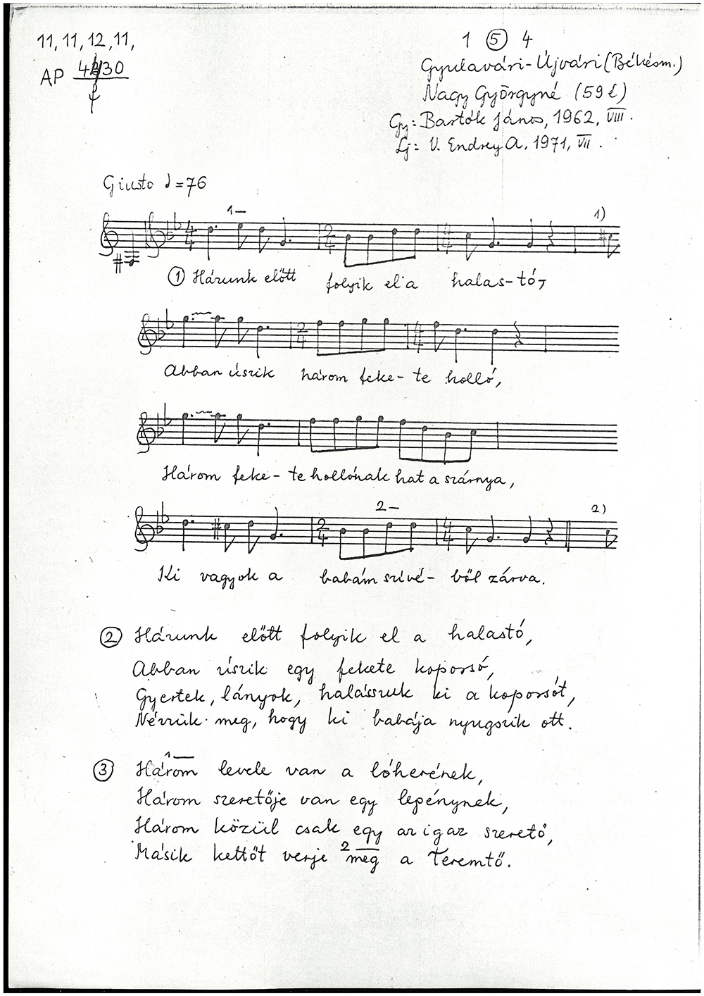 Kavicsos kútnál kinyílt liliomszál MTA BTK Zenetudományi Intézet 1961.03.19 Bartók János Gyulavári Békés Nagy Györgyné Tóth Margit   58 magyar