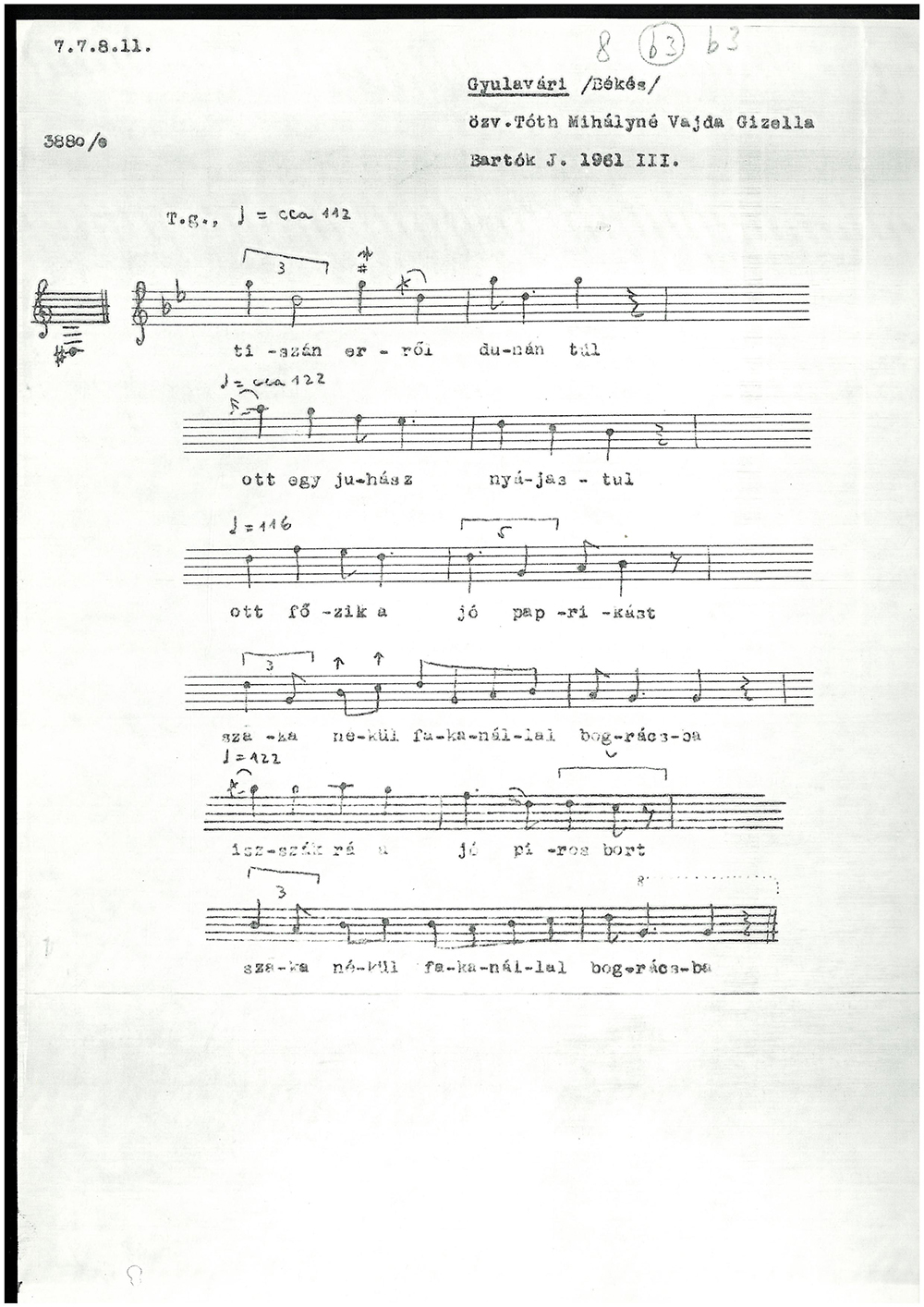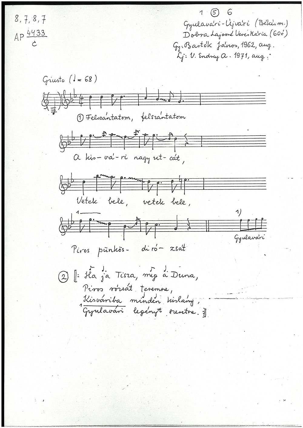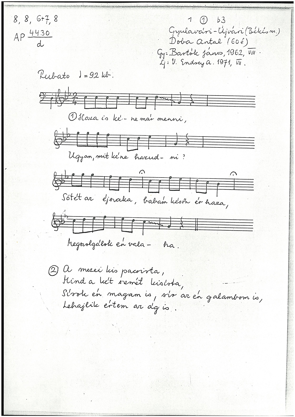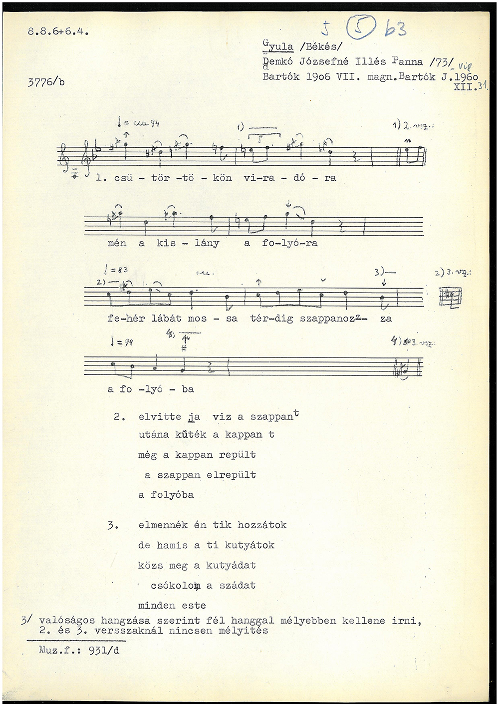 Kavicsos kútnál kinyílt liliomszál MTA BTK Zenetudományi Intézet 1961.03.19 Bartók János Gyulavári Békés Nagy Györgyné Tóth Margit   58 magyar