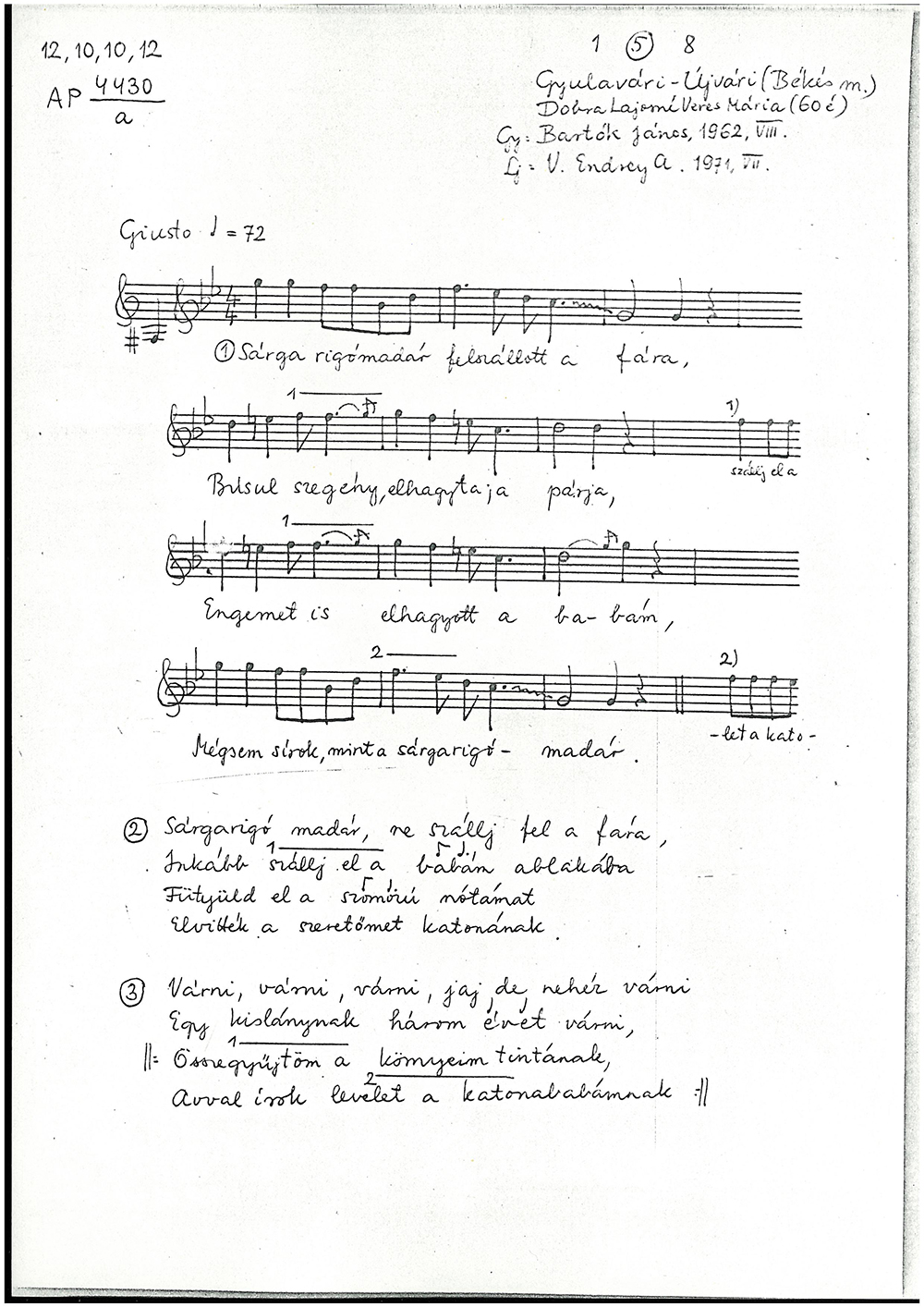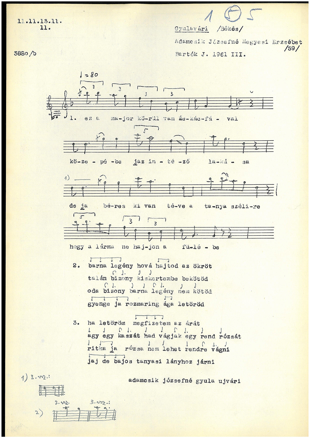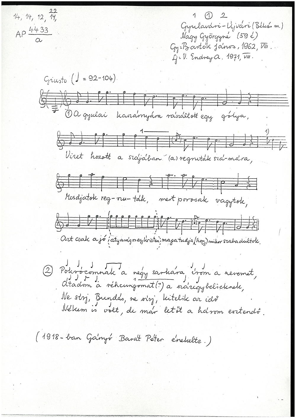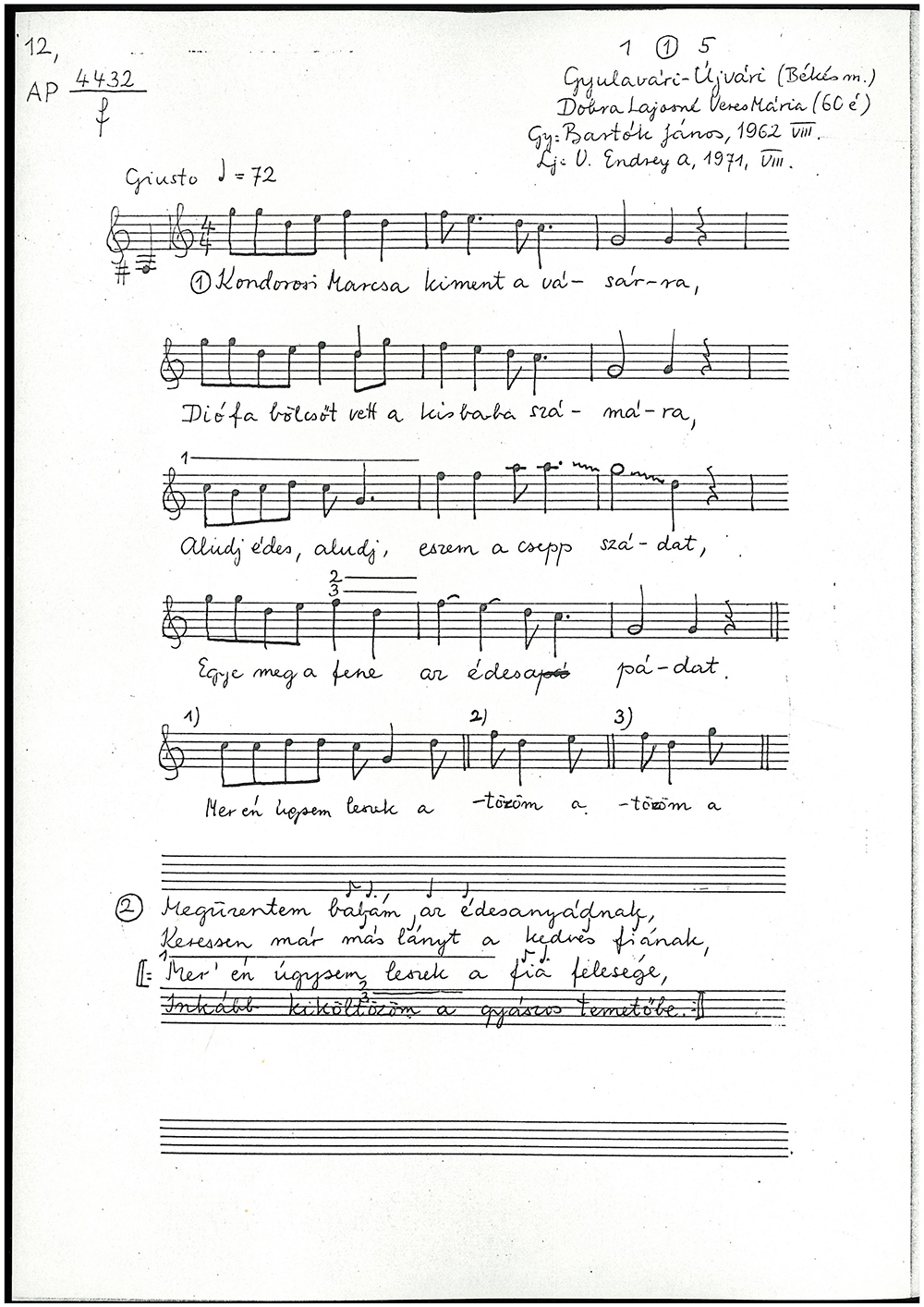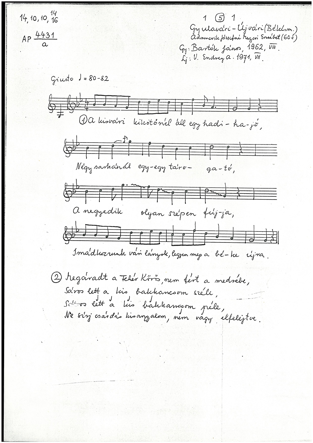 Kavicsos kútnál kinyílt liliomszál MTA BTK Zenetudományi Intézet 1961.03.19 Bartók János Gyulavári Békés Nagy Györgyné Tóth Margit   58 magyar