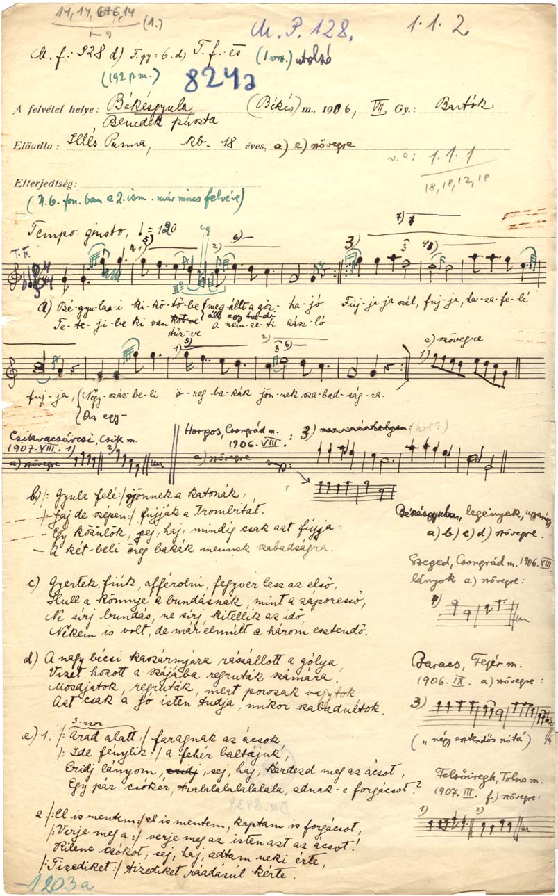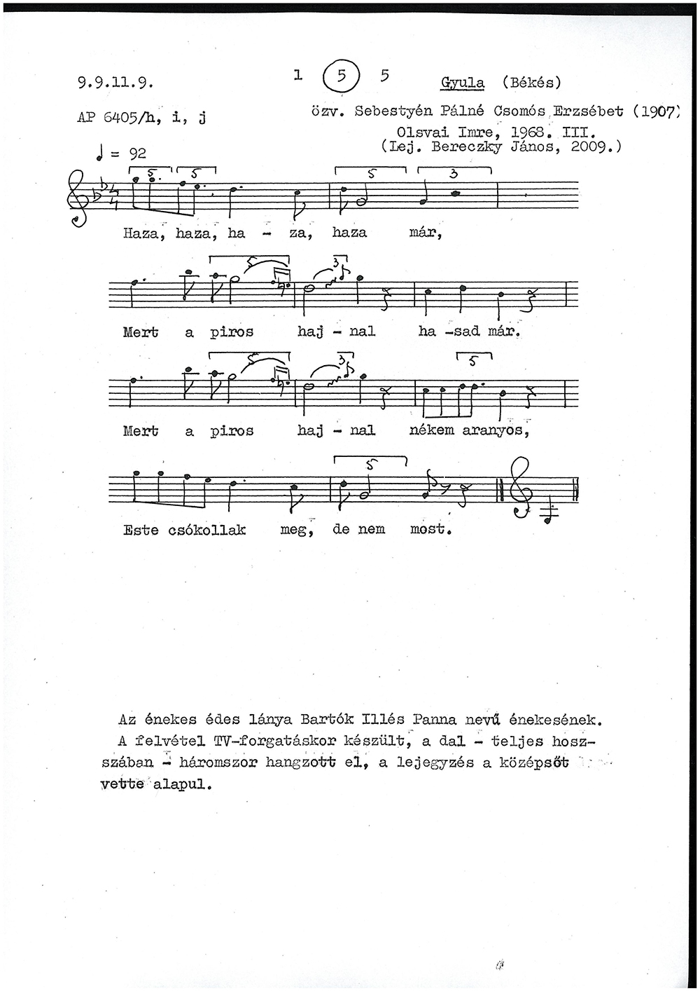 - Haza, haza, haza már MTA BTK Zenetudományi Intézet 1967.10.19 Olsvai Imre Gyula Békés özv. Sebestyén Pálné Gombos Erzsébet   60 magyar