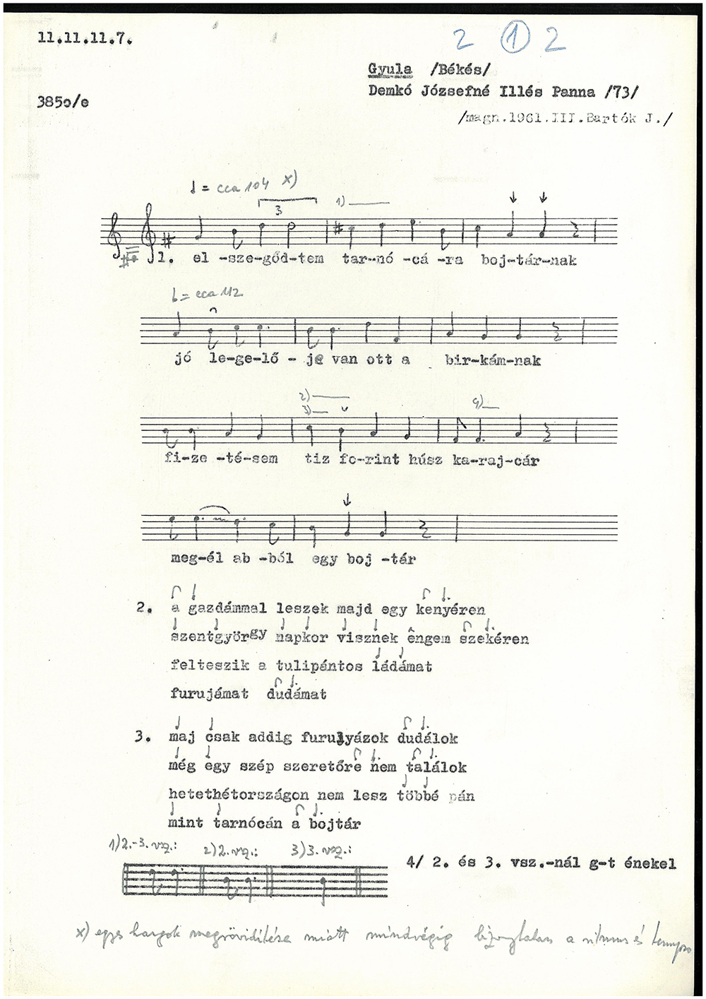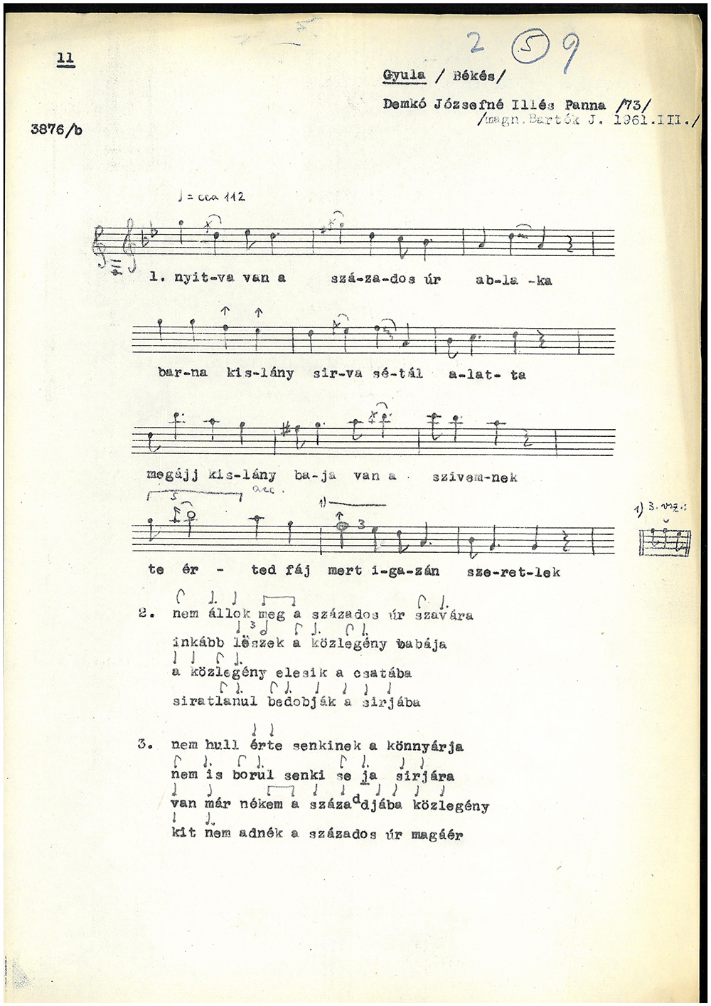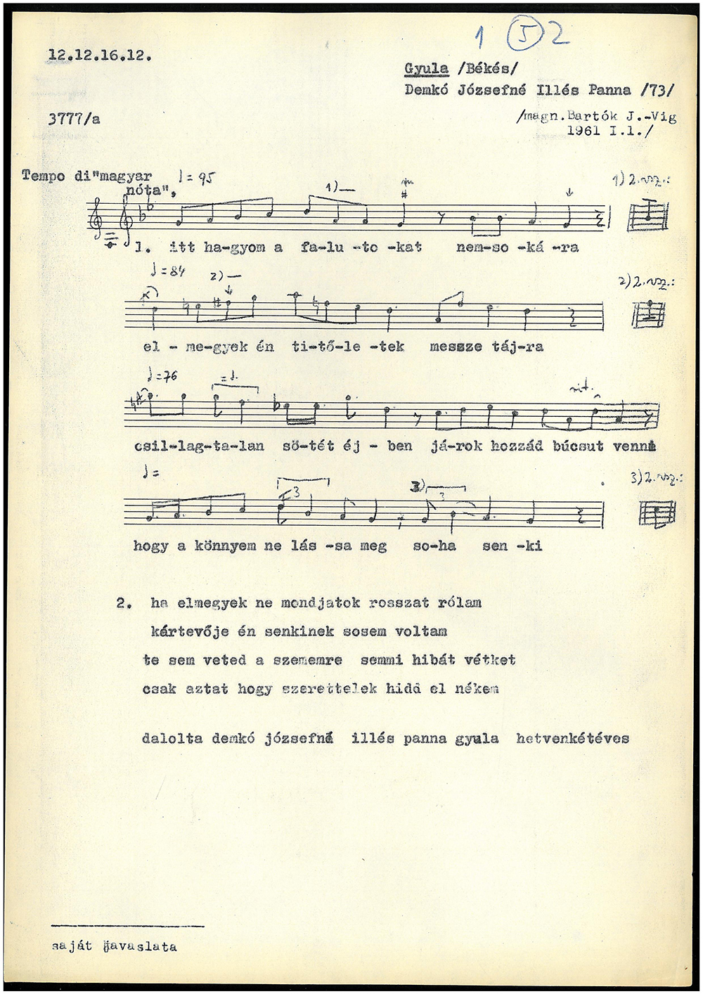 Itt hagyom a falutokat nemsokára MTA BTK Zenetudományi Intézet 1961.01.01 Bartók János Gyula Békés Demkó Józsefné Illés Panna   73 magyar
