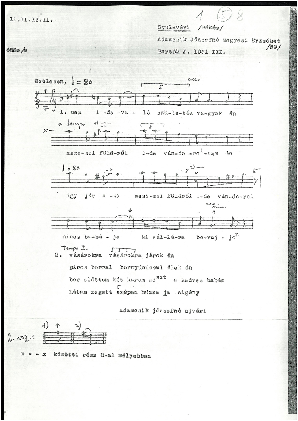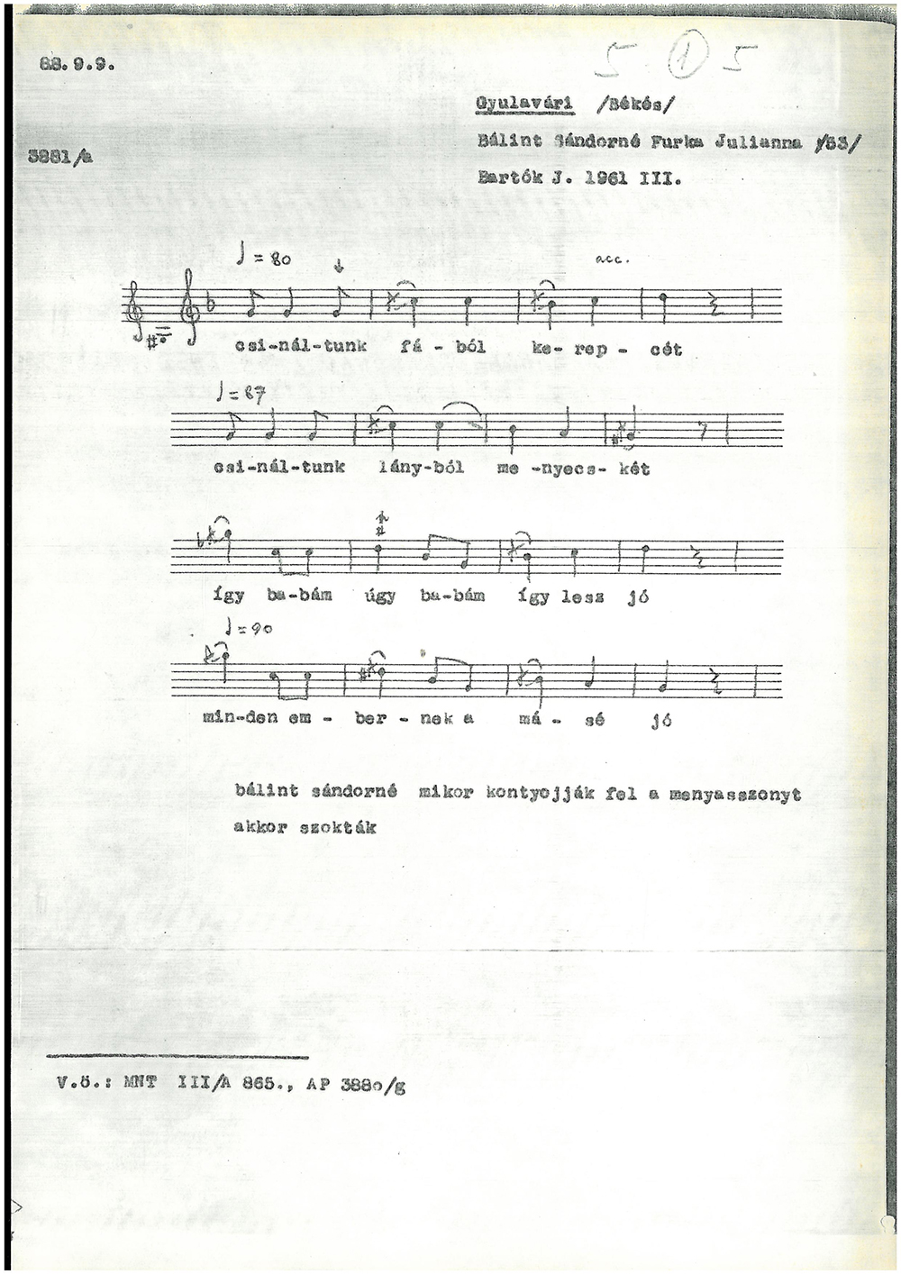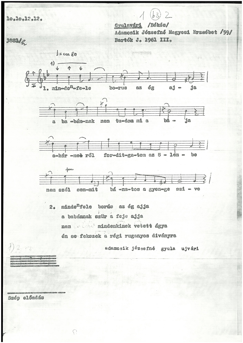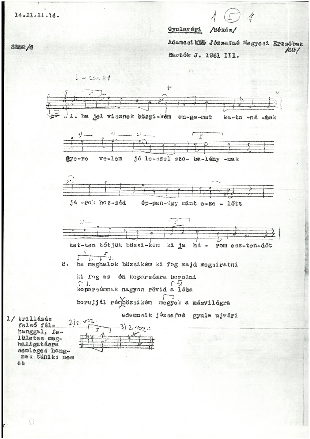Balog Böske fehér ágyát MTA BTK Zenetudományi Intézet 1961.01.04 Bartók János Gyulavári Békés Lengyel Lajosné Nagy Zsuzsánna   61 magyar