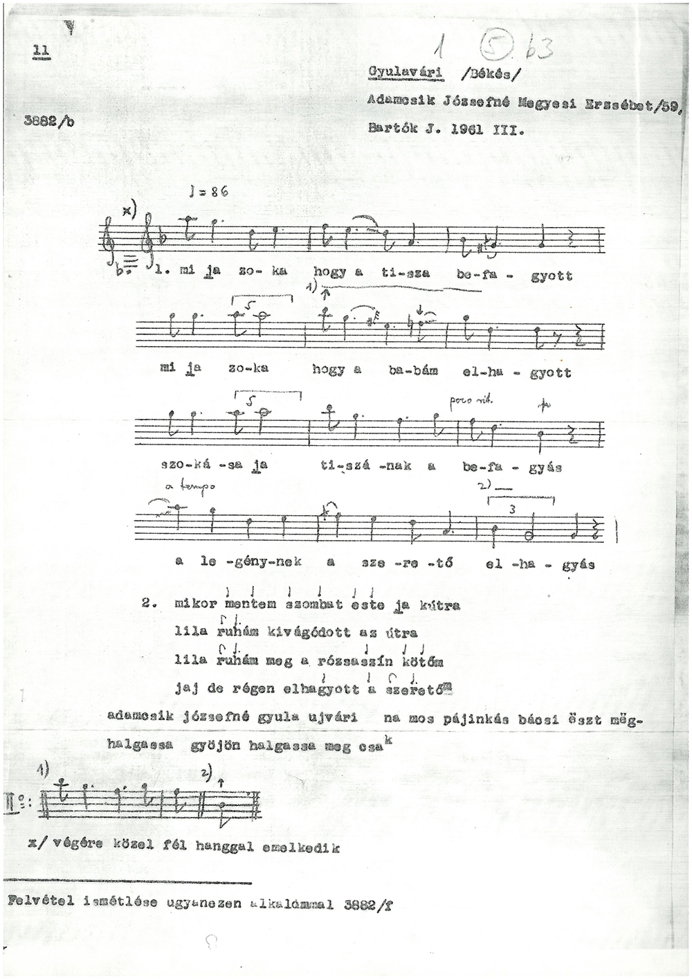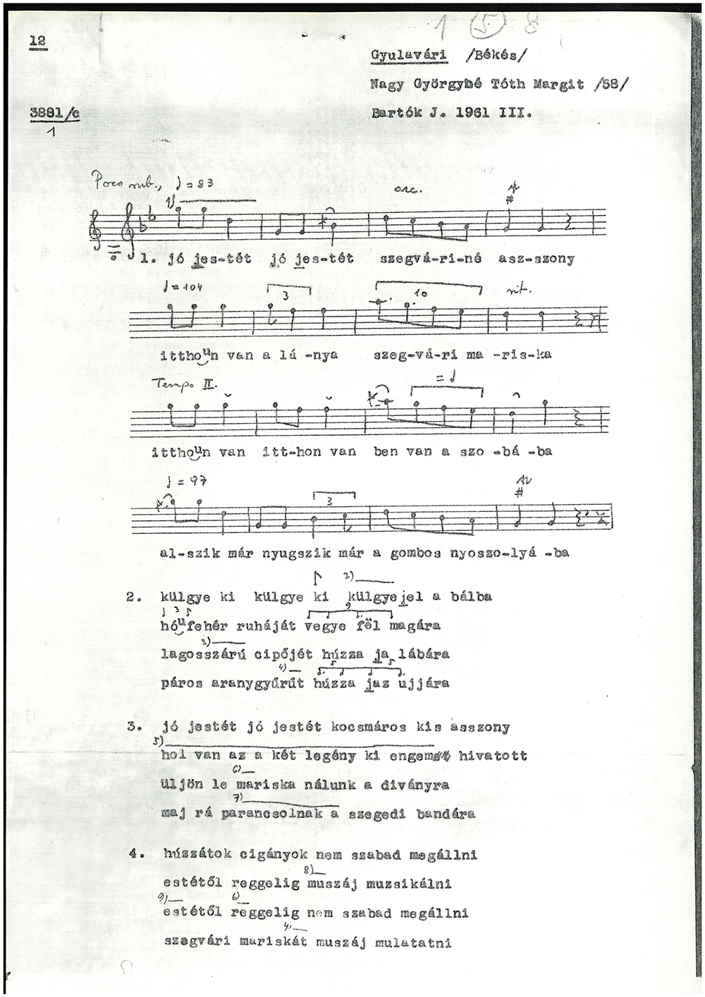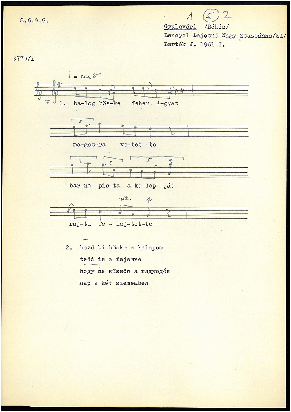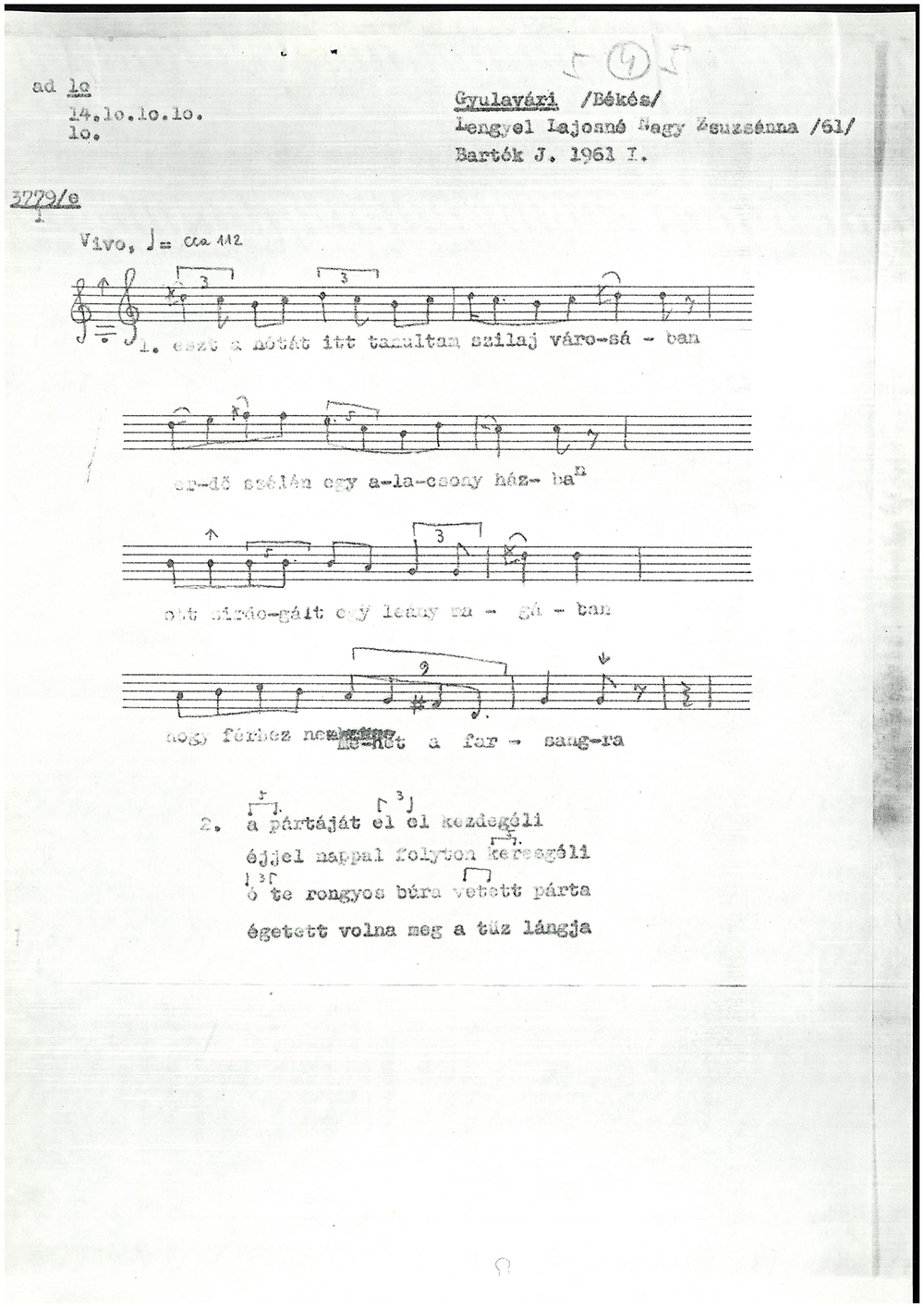 Balog Böske fehér ágyát MTA BTK Zenetudományi Intézet 1961.01.04 Bartók János Gyulavári Békés Lengyel Lajosné Nagy Zsuzsánna   61 magyar