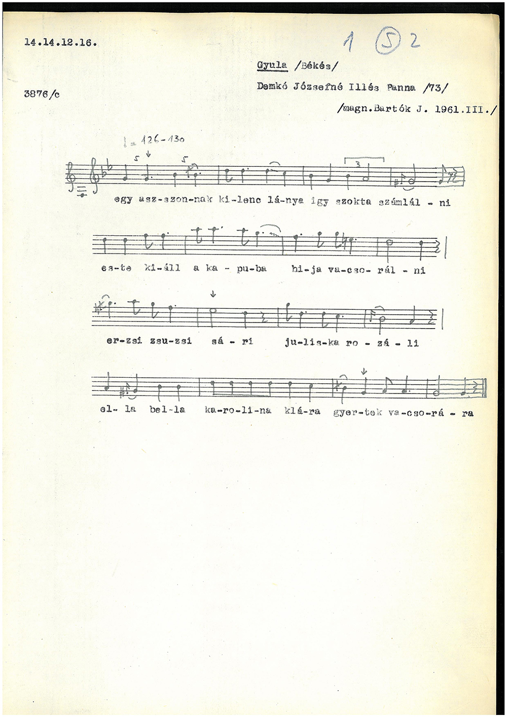 Egy asszonynak kilenc lánya így szokta MTA BTK Zenetudományi Intézet 1961.03.11 Bartók János Gyula Békés Demkó Józsefné Illés Panna   73 magyar