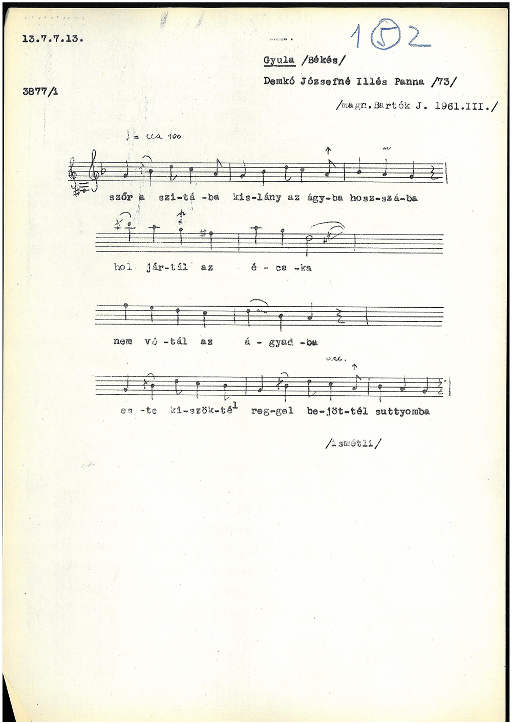 Nem messze van ide kis Margitta MTA BTK Zenetudományi Intézet 1961.01.01 Bartók János Gyula Békés Demkó Józsefné Illés Panna   73 magyar