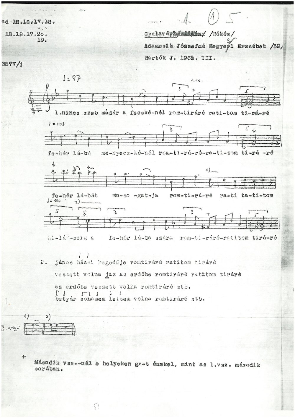 Nincs szebb madár a fecskénél MTA BTK Zenetudományi Intézet 1961.03.12 Bartók János Gyula Békés Adamcsik Józsefné Megyesi Erzsébet   59 magyar