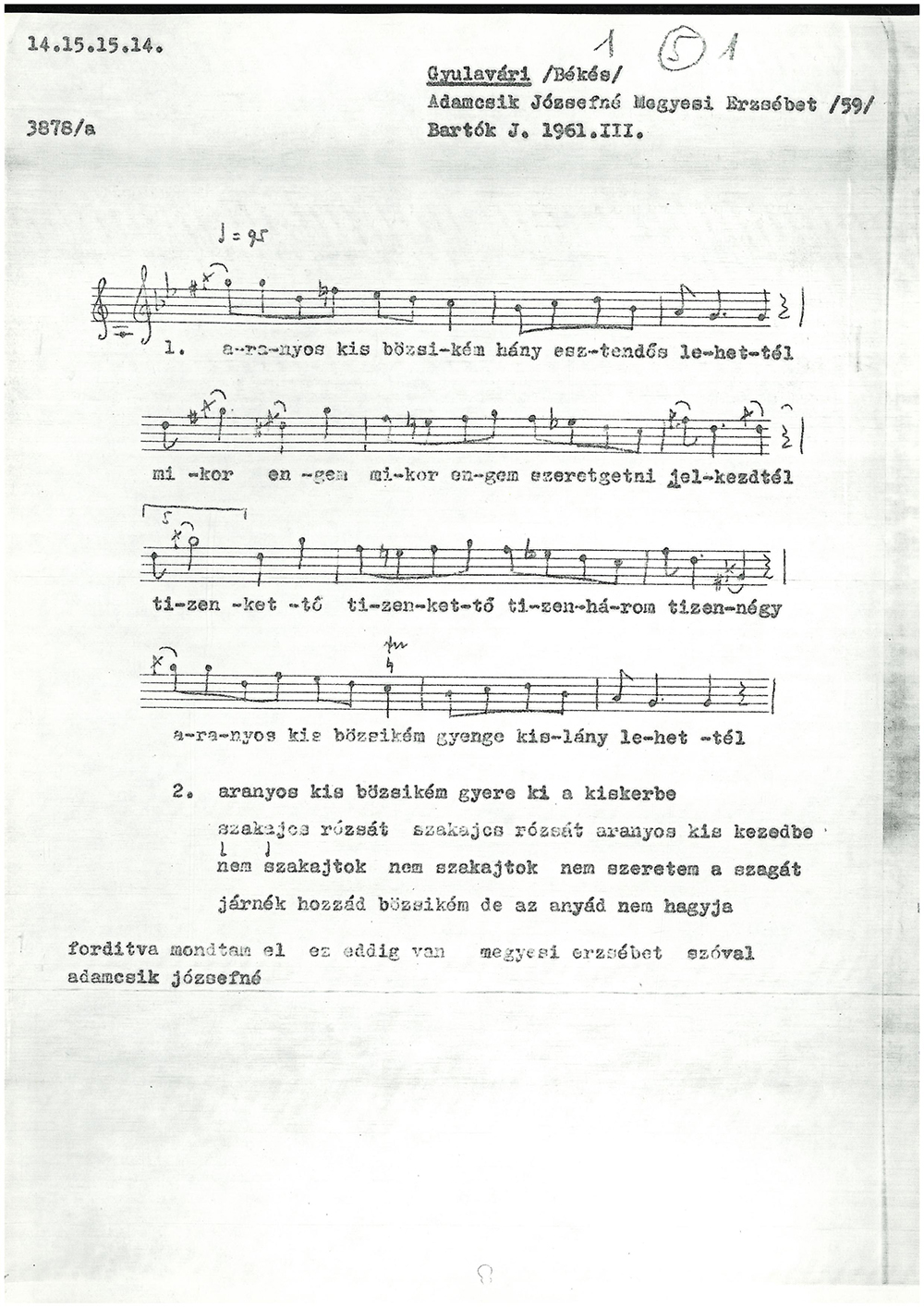 Aranyos kis Bözsikém hány esztendős MTA BTK Zenetudományi Intézet 1961.03.12 Bartók János Gyulavári Békés Adamcsik Józsefné Megyesi Erzsébet   59 magyar