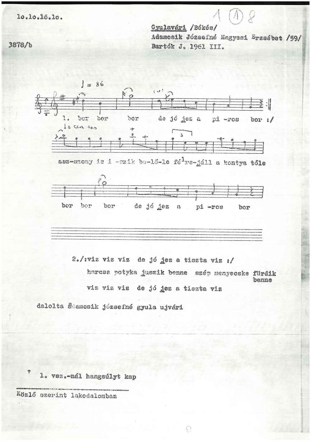 Fehér kancsó piros bor MTA BTK Zenetudományi Intézet 1961.03.19 Bartók János Gyulavári Békés Nagy Györgyné Tóth Margit   58 magyar