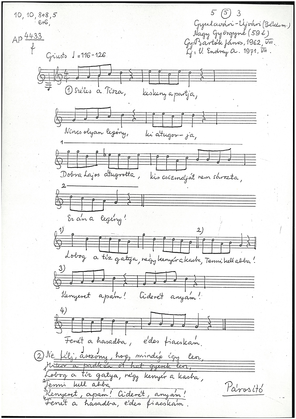 - Túl a Tiszán, jegenyefa tövébe MTA BTK Zenetudományi Intézet 1963.03.11 Paulovics Géza Gyulavári Békés Adamcsik Józsefné Medgyesi Erzsébet   60 magyar